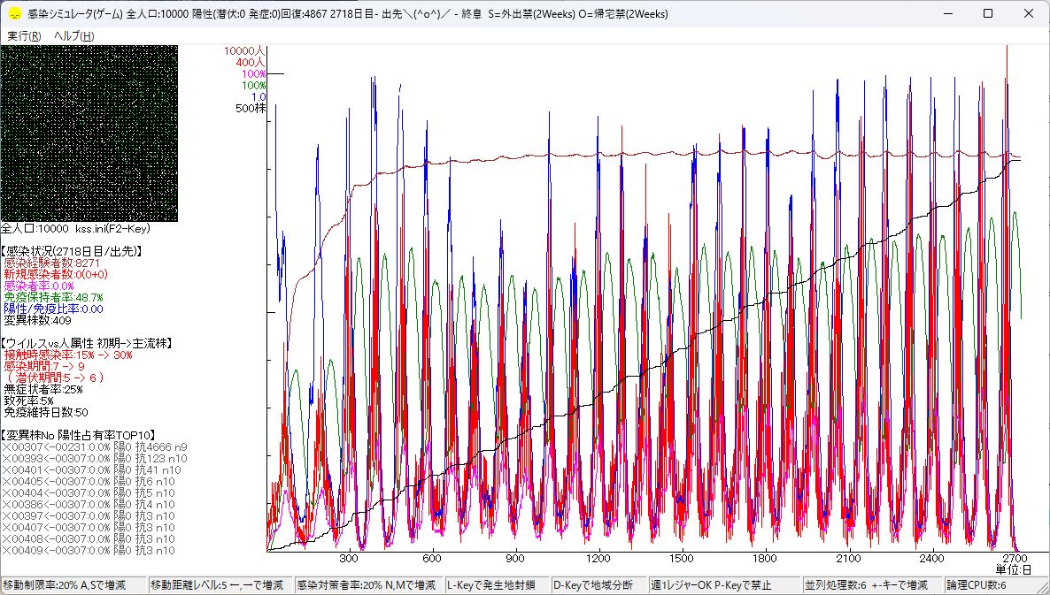 ウイルス進化の観察変異そのもの(免疫減衰)が根源か?感染シミュレータVer0.91以降、 各種設定値を初期設定ファイル(kss.ini)で指定できるようにしましたので、 色々な実験/テストが行えるようになりました。 とりわけ、おまけ機能の「変異モード」のシミュレーションにおいて、 変異したウイルスの属性値に増減を加えるのが基本なのですが、 その増減幅をあえてゼロに設定した場合、変異の方向性がどうなるかを検証してみました。 以下内容は、全て本シミュレータの模倣環境で確認した結果です。 【背景】 なぜ、このようなテストをしたかと言いますと、 Ver0.91で追加しましたC-Key(変異中断/再開機能)と、 H-Key(人為変異株投入機能)の双方を駆使してテストした結果で、 系統距離(≒感染シミュレータでは親等値)がある程度離れた株同士が生き残る傾向が出ていたのですが、 この時のテストでは、属性変異も含まれていたため、 純粋に親等距離単独で離れる方向に向くのか?というところでは、 若干詰められてない部分がありました。そこを探ってみようとしたわけです。 【テスト設定】 これは、あくまでも一例ですが、初期設定ファイル(kss.ini)内の変更から... まずは感染シミュレータで使用しているウイルス属性変異時の増減単位を、 以下のように全てゼロ設定にします。 #濃厚接触時感染率(%) INFECTION RATE(MUTATION UNIT) =0 #感染後回復するまでの日数 SICK DAYS(MUTATION UNIT) =0 #潜伏期間 HIDING DAYS(MUTATION UNIT)=0 #無症状率(%) FINE RATE(MUTATION UNIT) =0 #致死率(%) DEATH RATE(MUTATION UNIT) =0 #免疫維持日数 EFFECTIVE DAYS(MUTATION UNIT) =0 #一親等当たりの免疫減衰率 DEGREE DECAY RATE= 5.0 or 2.5 も変更しておきます。 初期値の20でもいいのですが、 傾向を見るには小さい方がいいかもしれないと思いましたので、 5.0と2.5の比較を行いました。 あとは起動して間もなく変異株が5個ぐらいまで増えたところで、 人為変異株投入(H-Key)を一度押すと、 感染力が上がるため収束しにくくなります。 非現実的ではありますが、観察する時には役立つことが多いです。 それからノイズを減らすため「A」キー連打で「移動制限率」を0%に変更、 「Nキー」連打で「感染対策者率」を0%にして3時間ほどすれば100年分のシミュレーションが行われます。 待ちきれない場合には「ESC」キーを押して下さい。中断しますが途中までの集計結果は出力されます。(kss.txt,mutation.txt) 【結果】 傾向を調べるために、 初期設定ファイルで指定する一親等あたりの免疫減衰率 "DEGREE DECAY RATE"の値を5.0と2.5で比較してみますと、 見えてきたのは、基本的には100%減衰に至った(互いの免疫が効かない)株同士が残って行く傾向が 見られました。すなわち"DEGREE DECAY RATE"の値が5(%)の場合には、 20親等越えぐらいのものが残っているのです。では2.5(%)の場合はどうか? 予想どうり残存株同士のほとんどが40親等越えになりました。 お互い共存する株間の免疫減衰が100%満了するまでは、 変異を続けるという結果になったわけです。しかし、これは見かけ上の結果で、 変異は減衰が100%満了していても続いています。 このような段階になると変異しても方向性はないため、 たまたま残るものが残っているという状況になります。 ですので40親等をちょっと超えたものもあれば、 47〜49ぐらいまで進んでいるものも見られます。 もっと時間をかければ方向性は無いながらも少しずつ多くなる傾向は出てくるでしょう。 ※当初は免疫減衰が100%満了した段階になると方向性は無くなると考えていたのですが、 設定を変更して色々テストしてみますと、より高世代株が残存してゆく傾向があることが判ってきました。 これはVer0.94で追加した指定株の変異停止/再開機能「SPACEキー」などを駆使し、 ウイルス環境を用意すれば分析可能なのですが、ウイルス属性の変異幅をゼロに設定し、 親等あたりの免疫減衰率も100%に設定、株間の優位性を全く失くしてしまっても、 なおもその傾向が確認できます。 残存できない株を分析しても特徴のある消滅があったわけでもないので、 モニタリングして詳細を観察してみますと、 まずは感染者を持つ有効株はどんどん増える傾向があります。 そしてある限界点まで来ると、増えるのと同じぐらい消滅するものも出てきて、 有効株数としては頭打ちになります。 「感染シミュレータ」の事例では90個(種類)ぐらいまで増えて、 それ以上増えなくなるケースがよく確認(Ver0.95以降確認可能に)できます。 優位性の等価な株同士が増えてくると、 自ずと感染者数を分け合うようになります。株あたりの感染者が減った状態でも、 ある程度の波があり振幅の影響でボトムがゼロに近づいているので、 消滅する場合があるようです。 このような状況下で全ての株に共通して言えるのは、 消滅する可能性のある機会が何度も訪れてきます。 では低世代株と高世代株の違いは何か?単に何度経験するかの違いだけです。 その機会の多い株は消滅しやすく、少ない株は消滅する可能性が低い。 それ